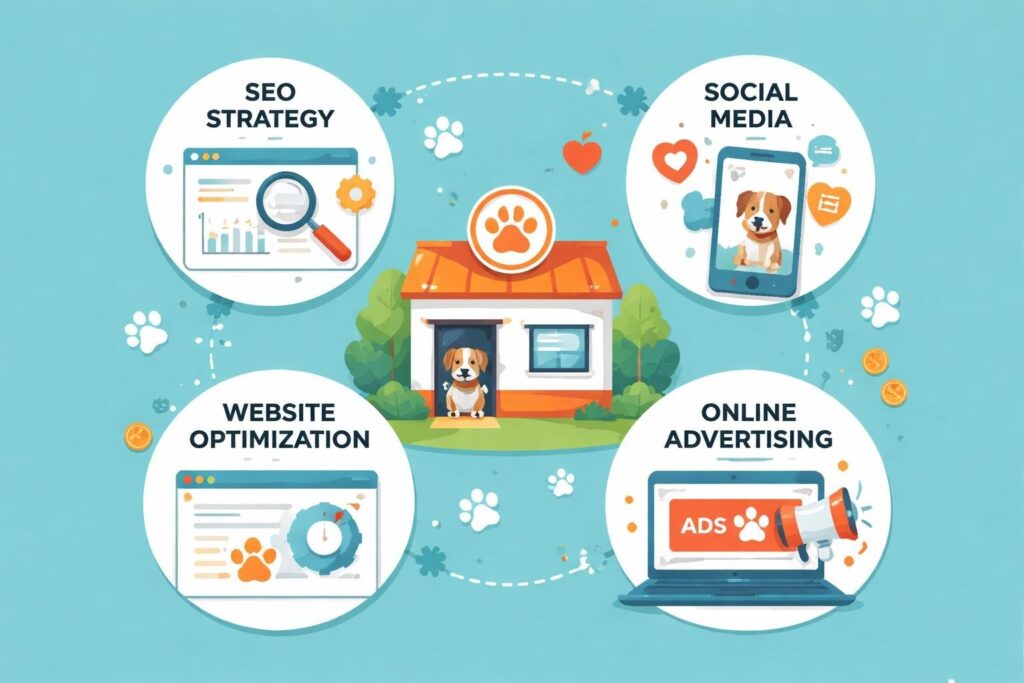 Discover proven digital marketing strategies for dog boarding businesses. Learn SEO, social media, ads, and web tactics to fill your kennel.